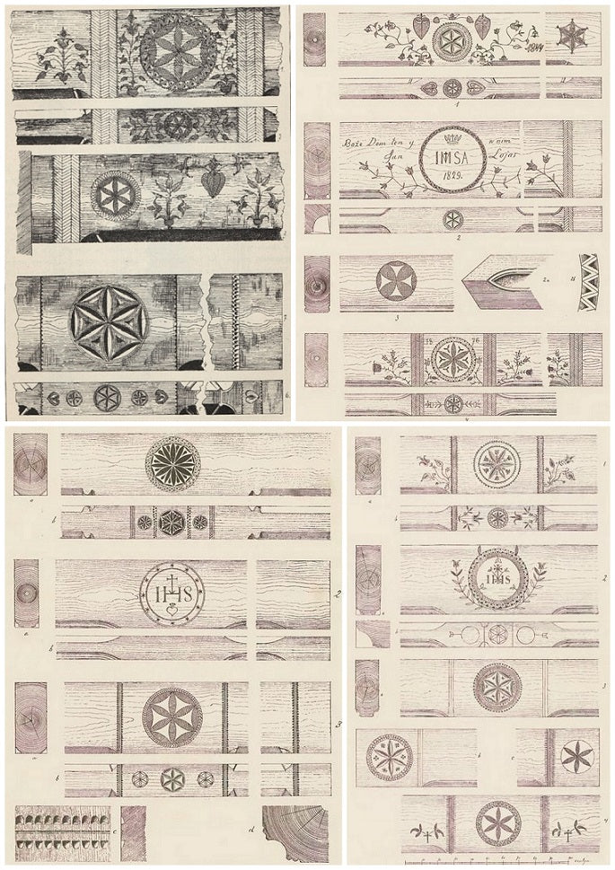 Pages from two of Władysław Matlakowski’s books about folk architecture in Podhale with drawings of crossbeams with the rosette