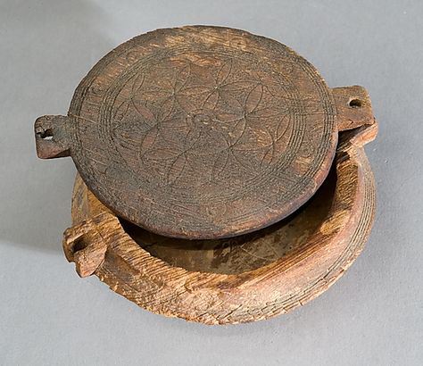 A circular wooden cosmetic box with a swivel lid1 in the The Metropolitan Museum of Art in New York. Thebes, Egypt, 1492 - 1473 BC.