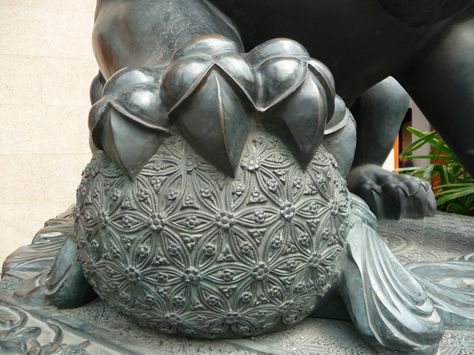 An earth sphere under the Fu Dog (or male lion/Buddha). This is a common defender statue on the houses and temples in the Ming and Qing dynasties. The picture is of one of the stone lions guarding the Jing'An Temple in Shanghai, China. Undated. (Photo © Tyson Amick3)