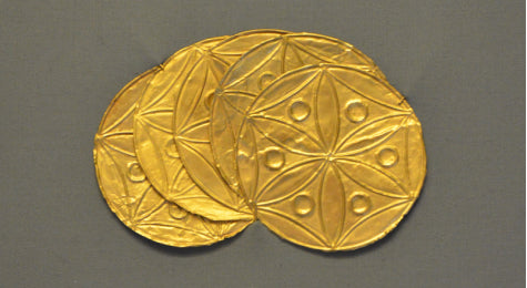Mycenaean funerary gold foil attachments with six-petal rosette geometry found from the Archeological Museum of Istanbul. Mycenae, Greece, 1600 BC.
