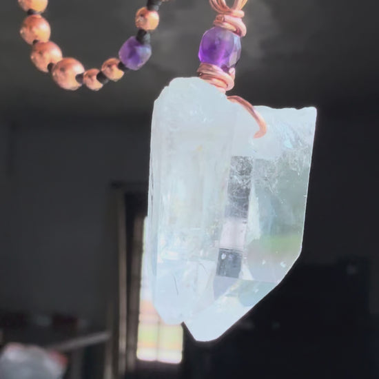 🌈So many rainbows in this quartz! Just finished 💜 this is a high energy piece with quality, faceted amethyst, copper, and a drilled quartz point. 📿