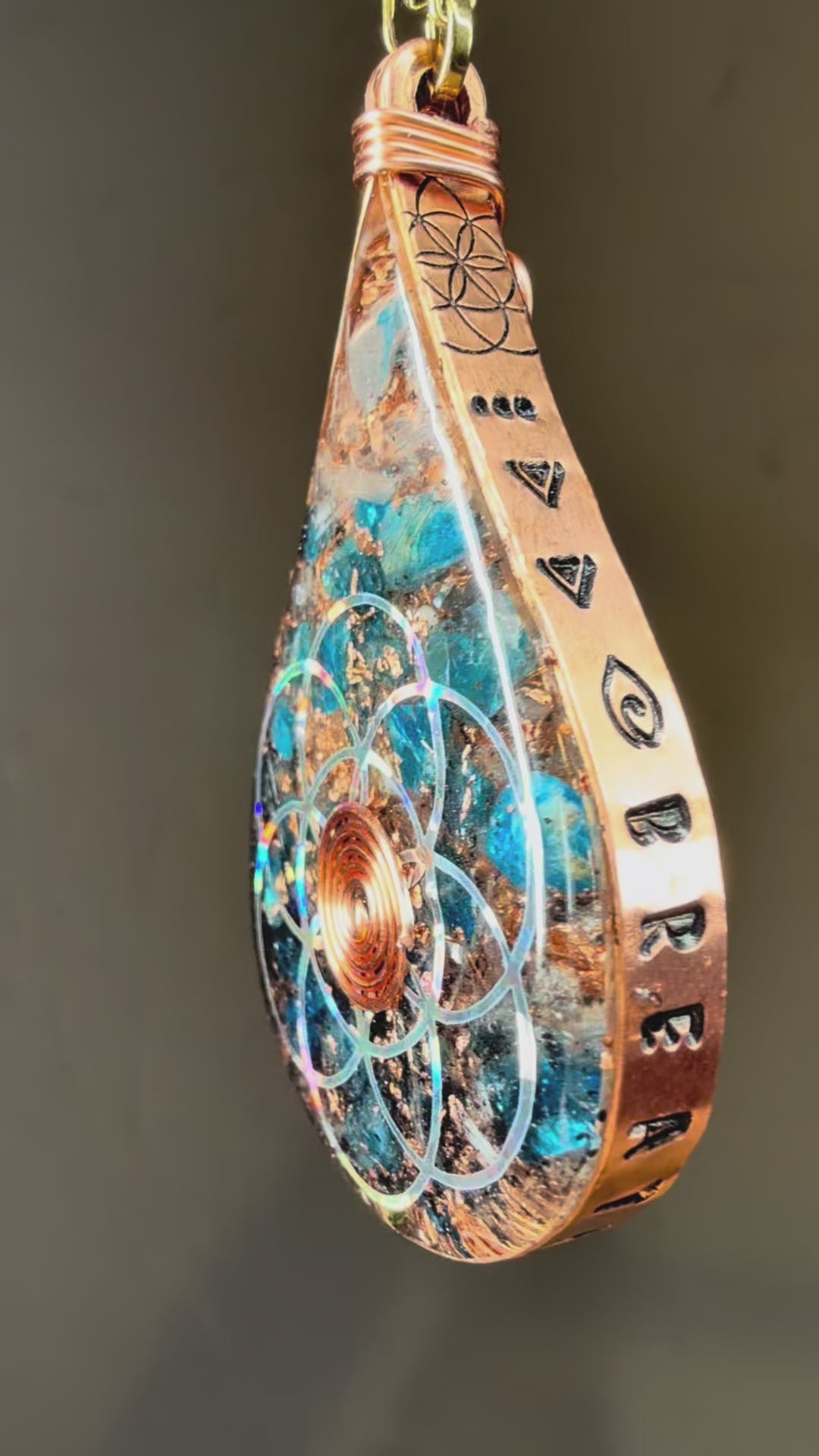Orgonite necklace with blue apatite, selenite, elite shungite, clear quartz, diamond quartz, and copper. Infused with Reiki~Made with love.