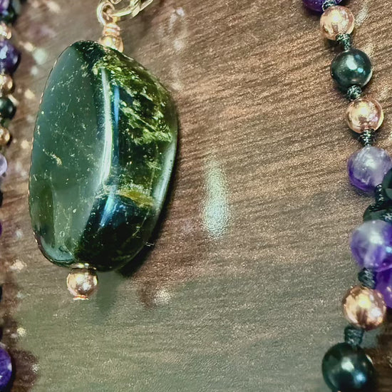 Beautiful hand knotted Mala necklace (around 24 in with no clasp, must fit over head) with Amethyst, Copper, Shungite, and Black Tourmaline. The centerpiece for this Mala, or Guru bead, is a polished Green Tourmaline. Here are some properties for Green Tourmaline :) (This piece is interchangeable and can be removed to add a different pendant)