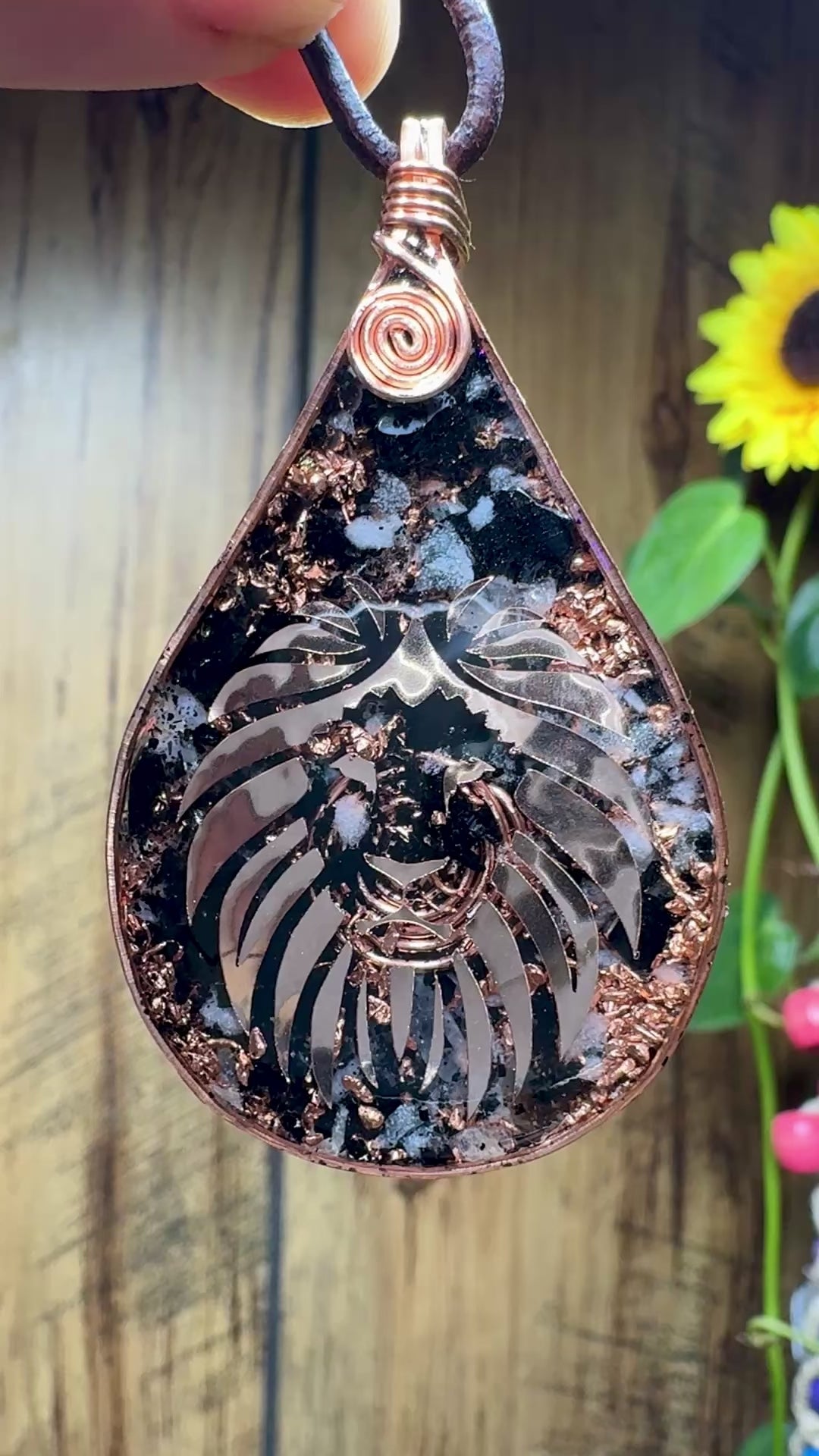 Stamped with “face your fears” in copper, it’s made with black tourmaline, obsidian, Yeh Ming Zhu (a glow-in-the-dark stone), diamond quartz, clear quartz, elite shungite, and a grounding copper coil that extends from the back.