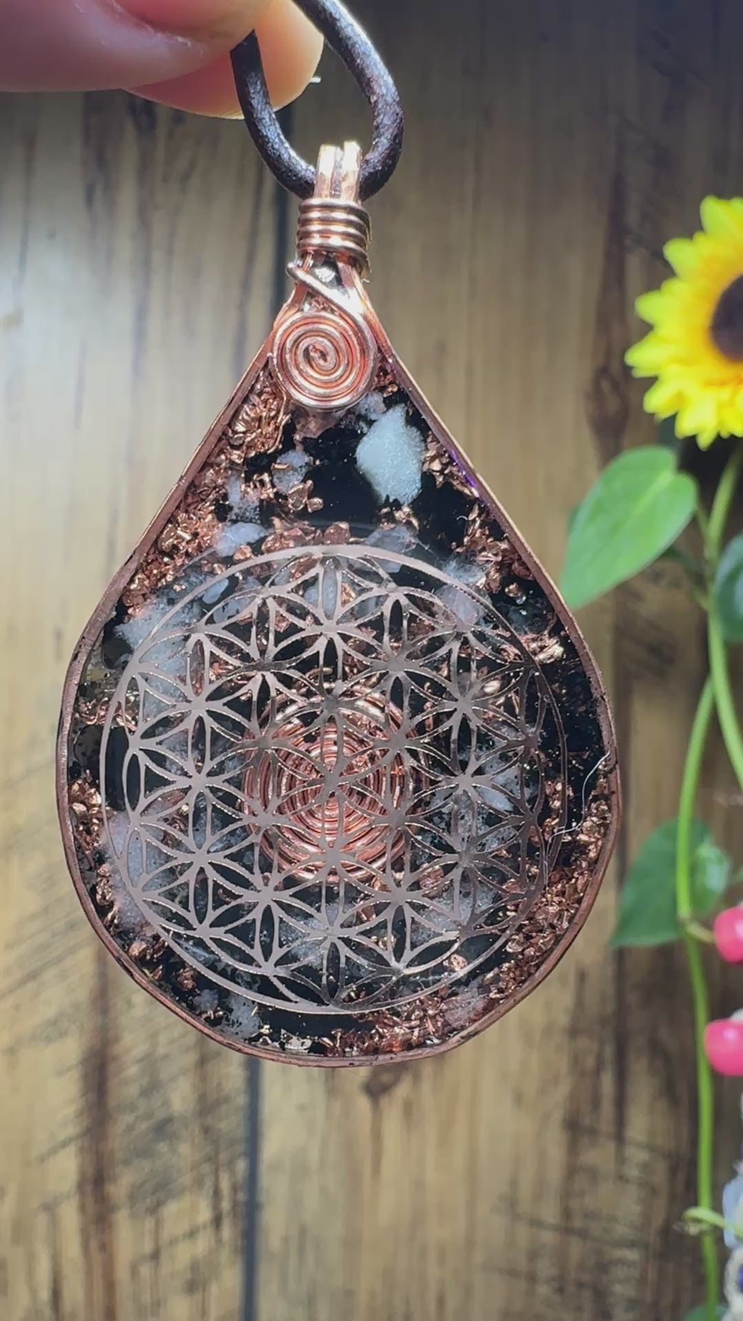 This orgonite piece features Yeh Ming Zhu (a soft glow-in-the-dark stone), obsidian, black tourmaline, elite shungite, clear quartz, diamond quartz, and copper—all chosen for protection, clarity, and grounding.