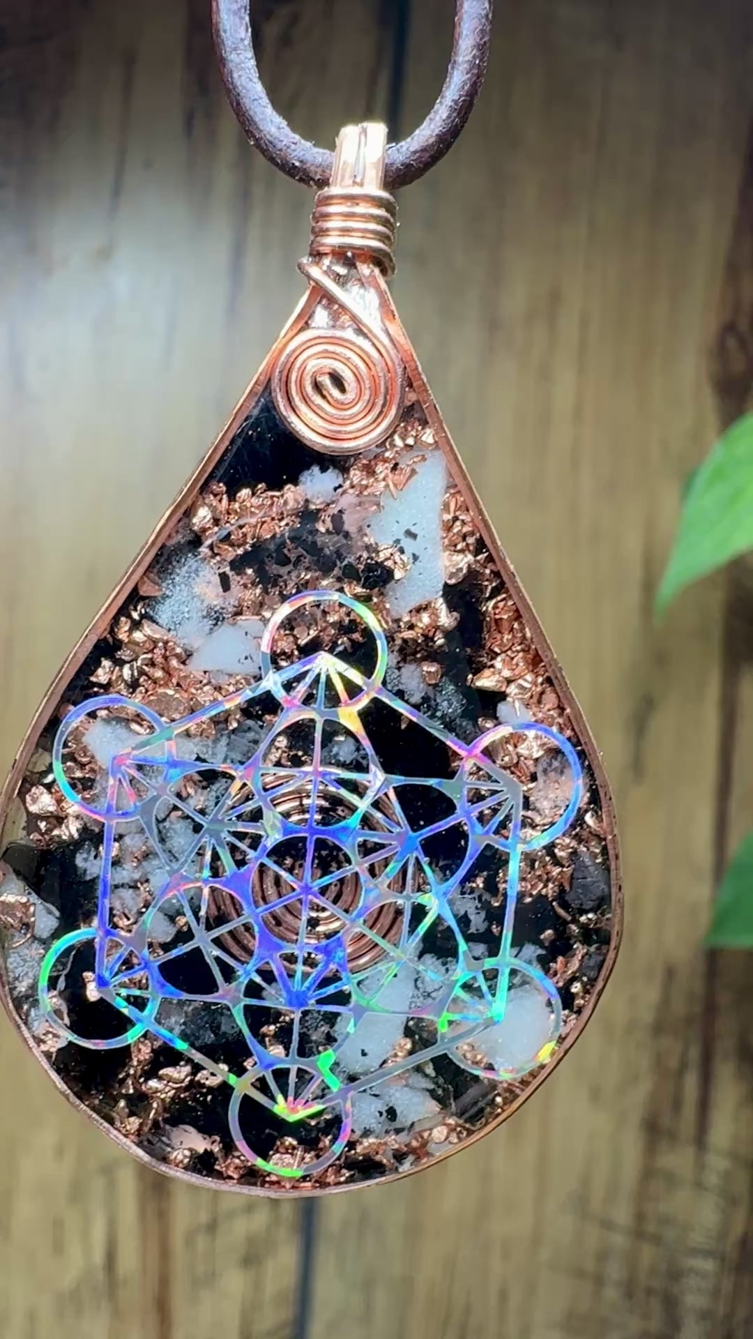 This piece has YEH MING Zhu, obsidian, black tourmaline, clear, quartz, diamond, quartz, elite shungite, and copper.