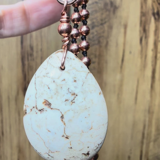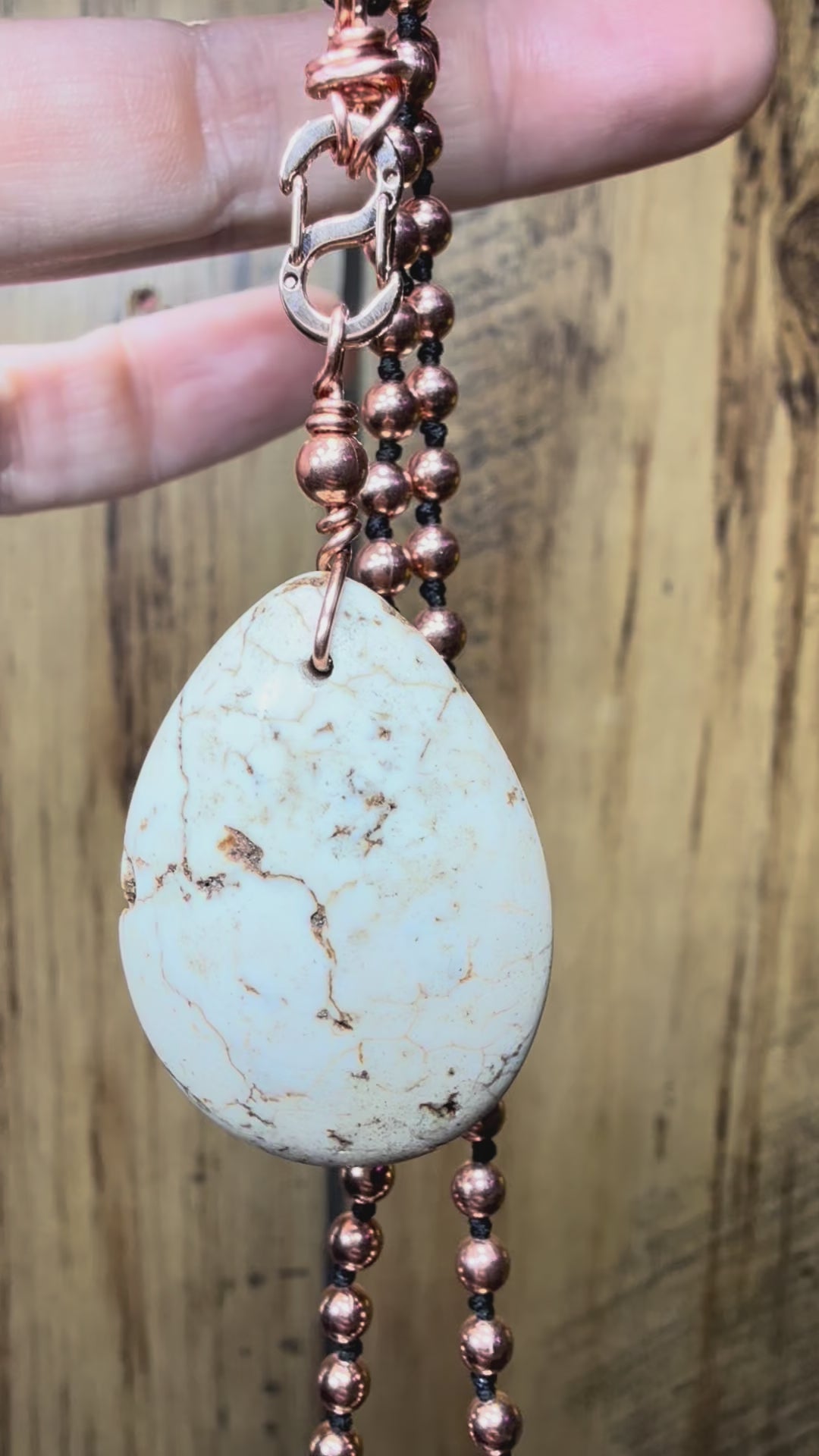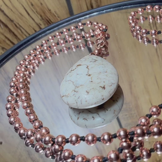 Hand knotted Mala created with copper beads and on an interchangeable clasp. This piece comes with a howlite pendant. Howlite is a great stone for stress relief and anxiety. It can also help to bring mental clarity for decision making. This piece can be a powerful tool for helping to center your mind and heart and learning to find stillness in your breath.