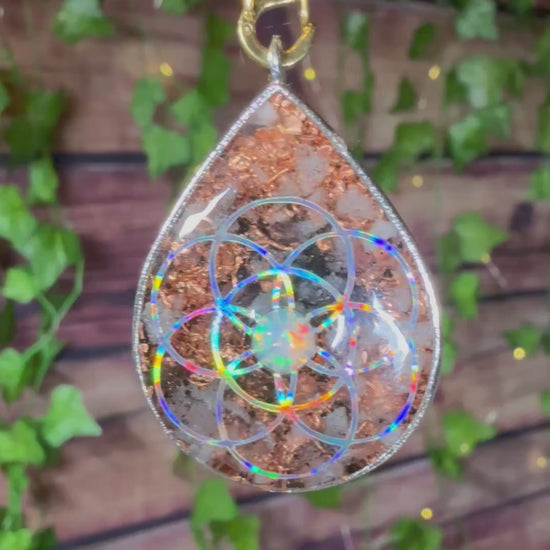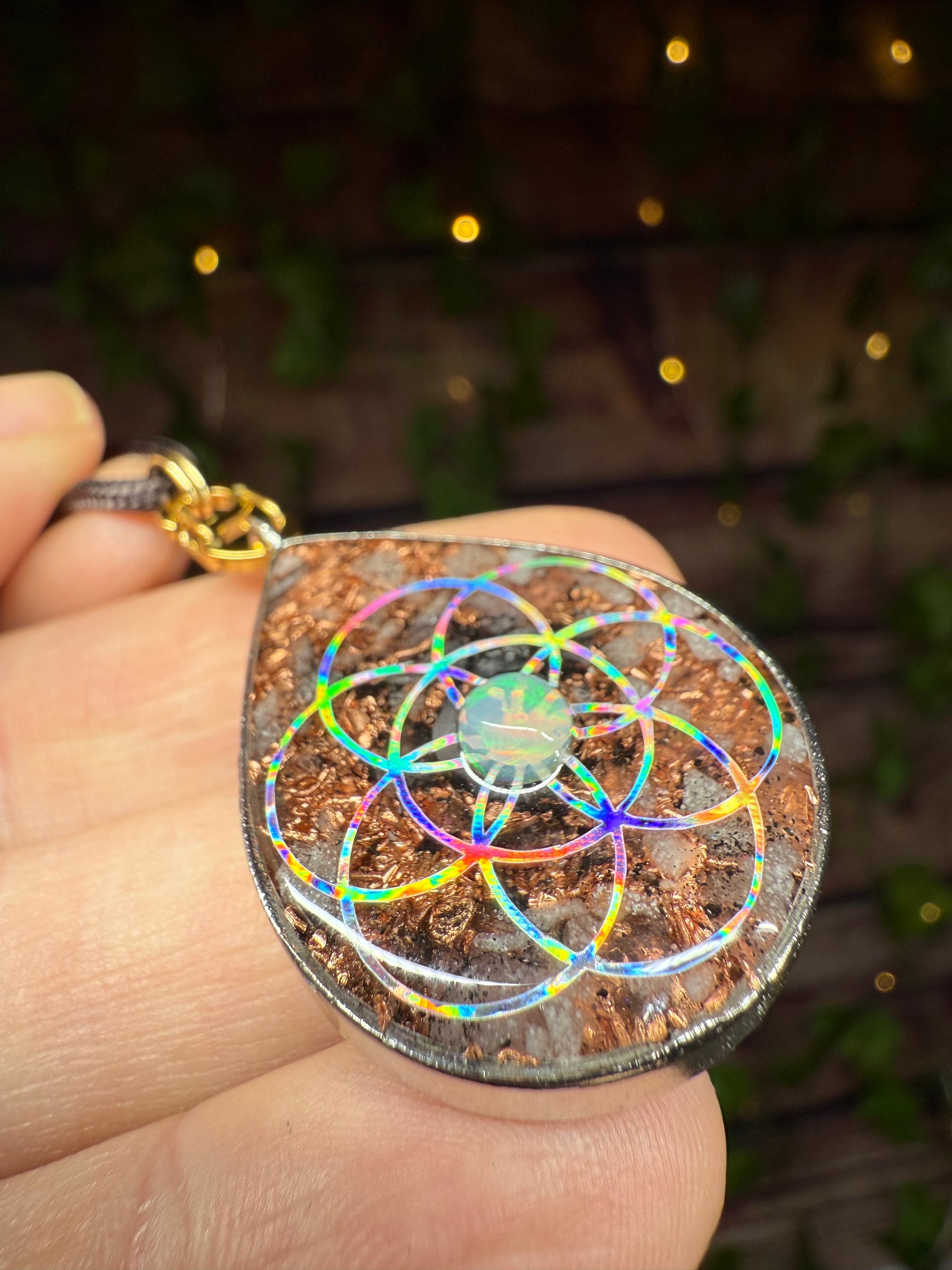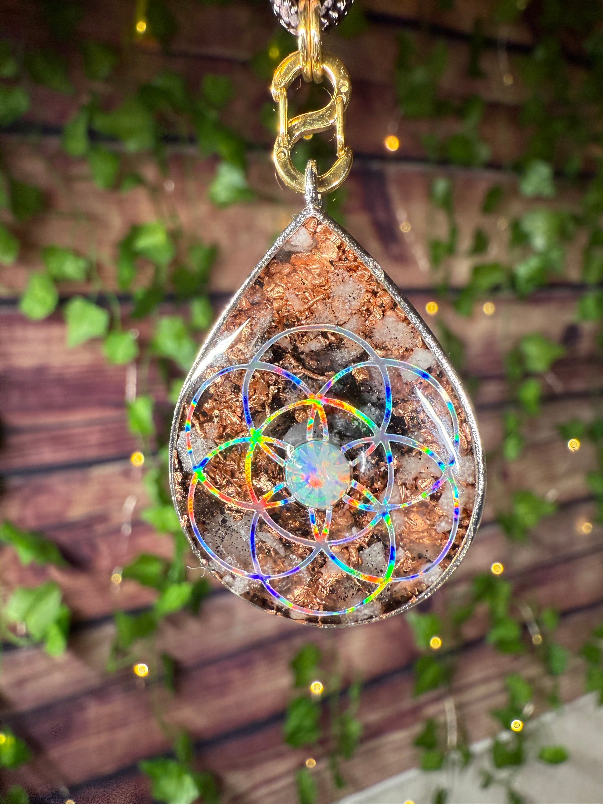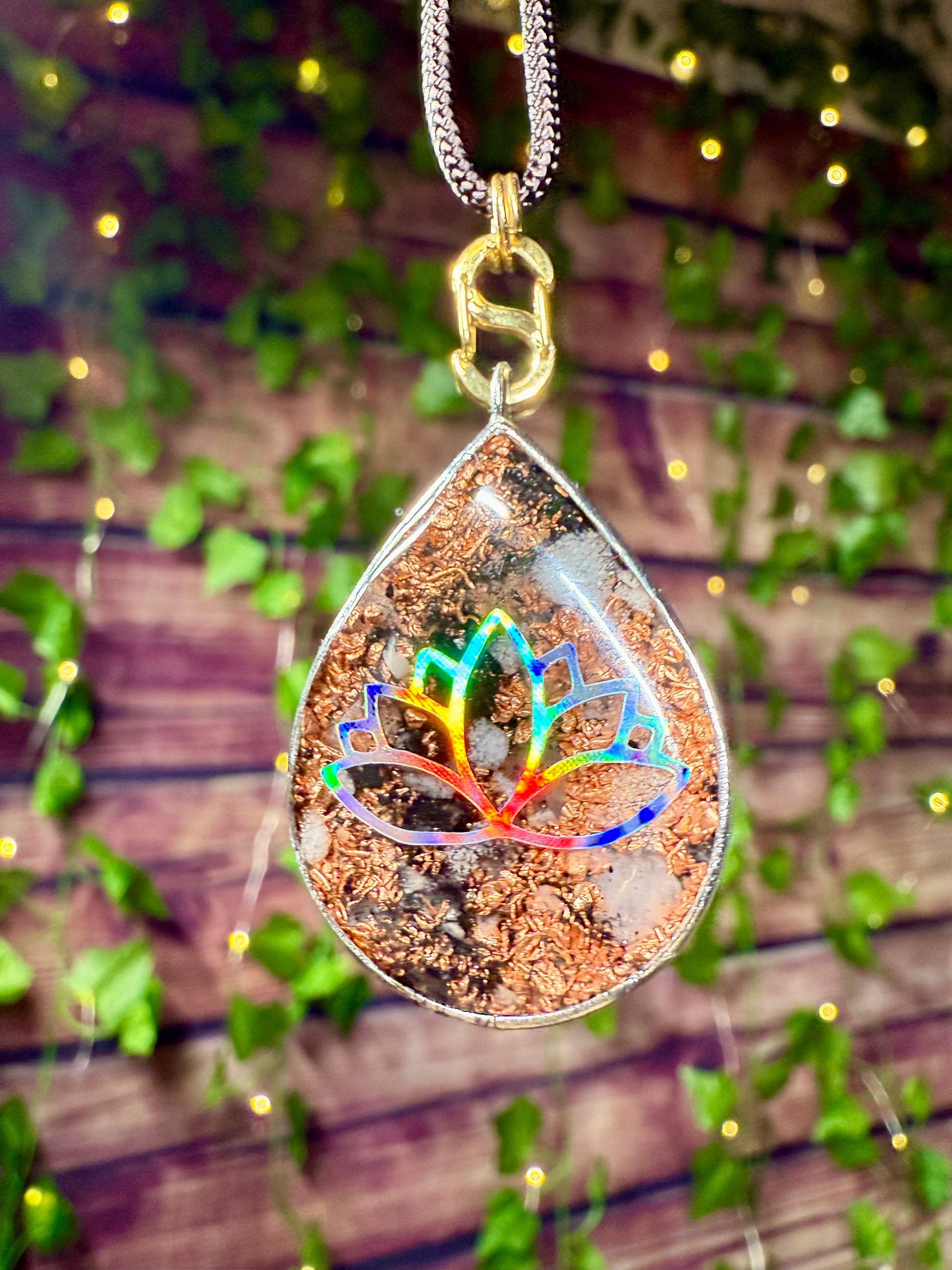 This piece is for tuning into your heart. Learning to let go and love yourself where you are at. With rose quartz, elite shungite, yeh Ming Zhu (glow!), diamond quartz, copper, opal on top, inlayed in an aluminum nickel free bezel. Adjustable and comes with interchangeable clasp!