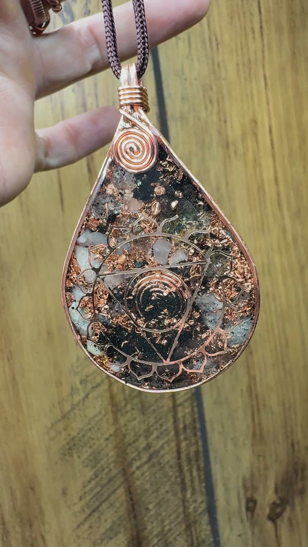 This piece was created to help with the Throat Chakra 🩵 with Aquamarine, Elite Shungite, Diamond Quartz, Clear Quartz, and copper. There is a slight imperfection on the top (from where the symbol lifted some)