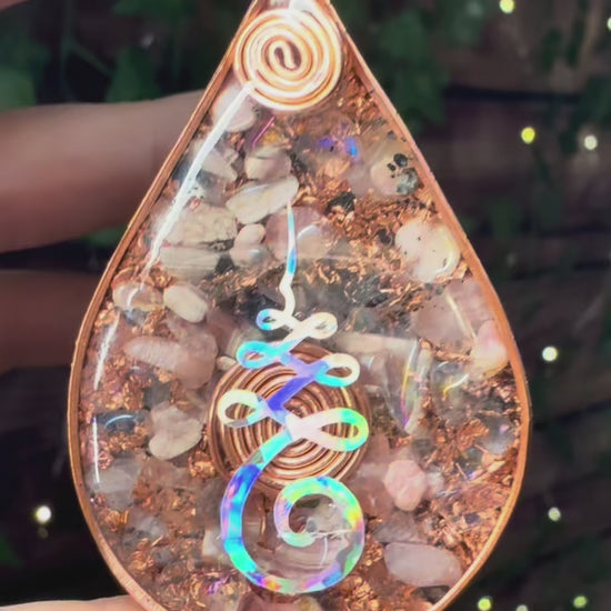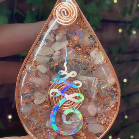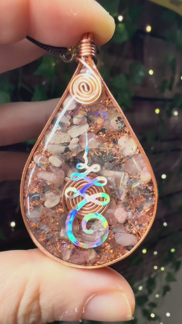 The Unalome is a symbol of the souls journey. The highs and lows and the moments that make us who we are. With aura quartz, rhodocrosite, rose quartz, elite shungite, diamond quartz, and copper. Stamped With the heart chakra along the copper and the seed of life. Infused with reiki ~Made with love
