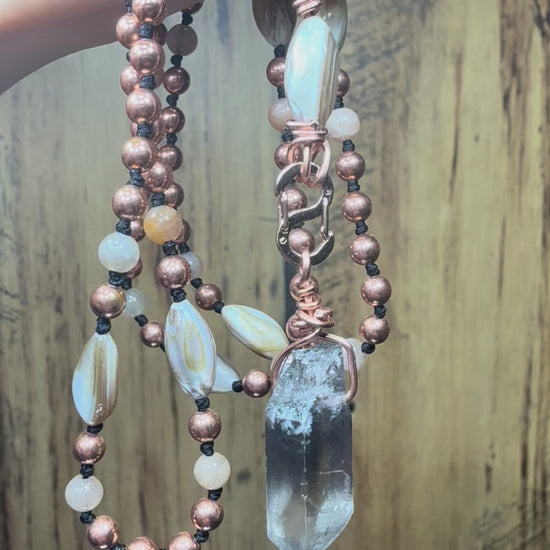 This piece is handcrafted with stones and metals to help increase confidence, joy, and flow in your life~ made with 4mm copper, sunstone, and shells, this piece is a reminder to stay light, let yourself flow, and come into alignment with your truth. This is hand knotted and attached to an interchangeable clasp with a powerful Tibetan Quartz Charm.