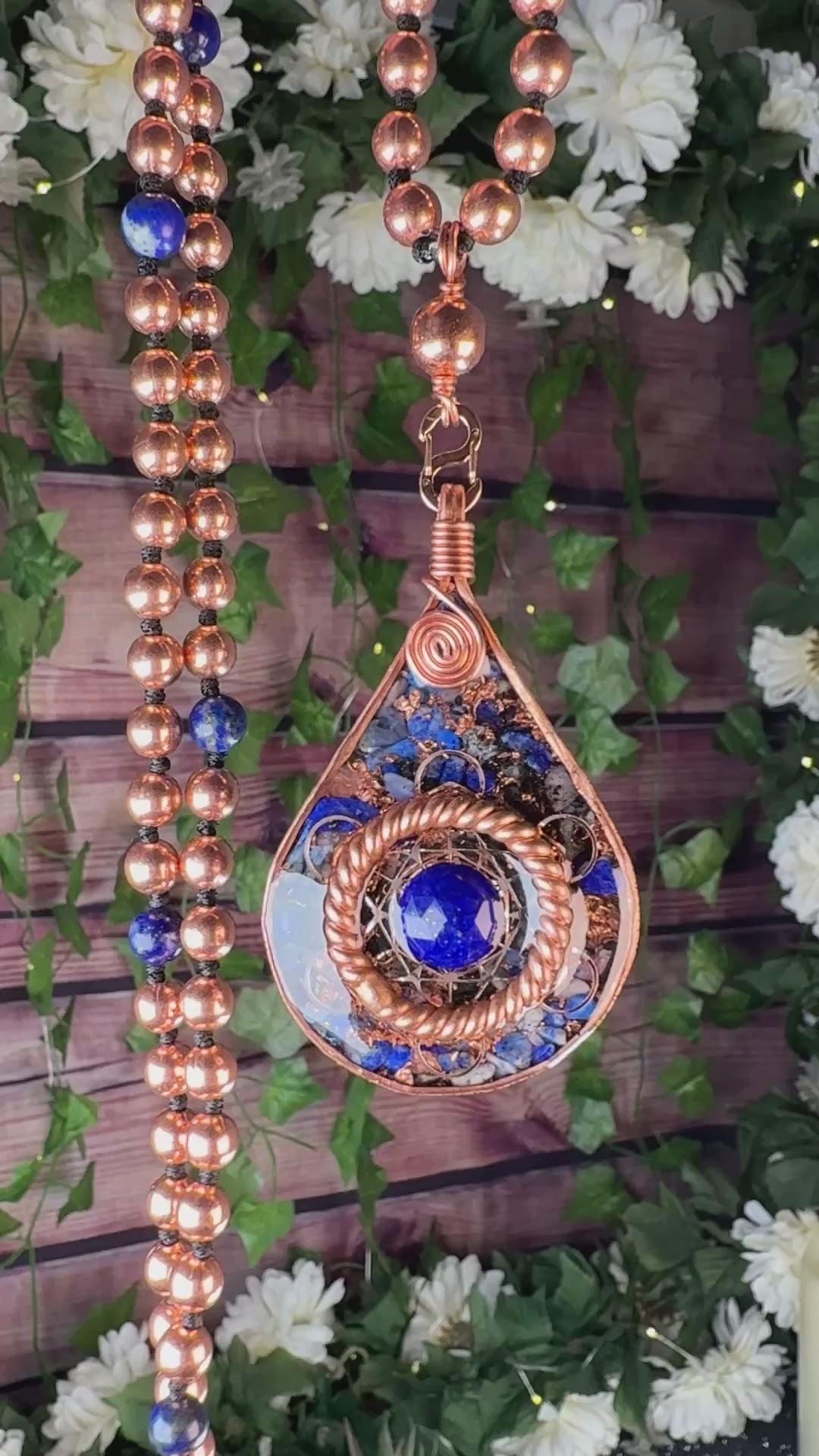 With Lapis Lazuli, Diamond Quartz, Clear Quartz, Elite Shungite, Copper, Sacred Cubit Tensor Ring, and Lapis Cabochon. This orgonite piece is on a 108 hand knotted copper and lapis beaded interchangeable Mala that can be used for meditation or prayer.