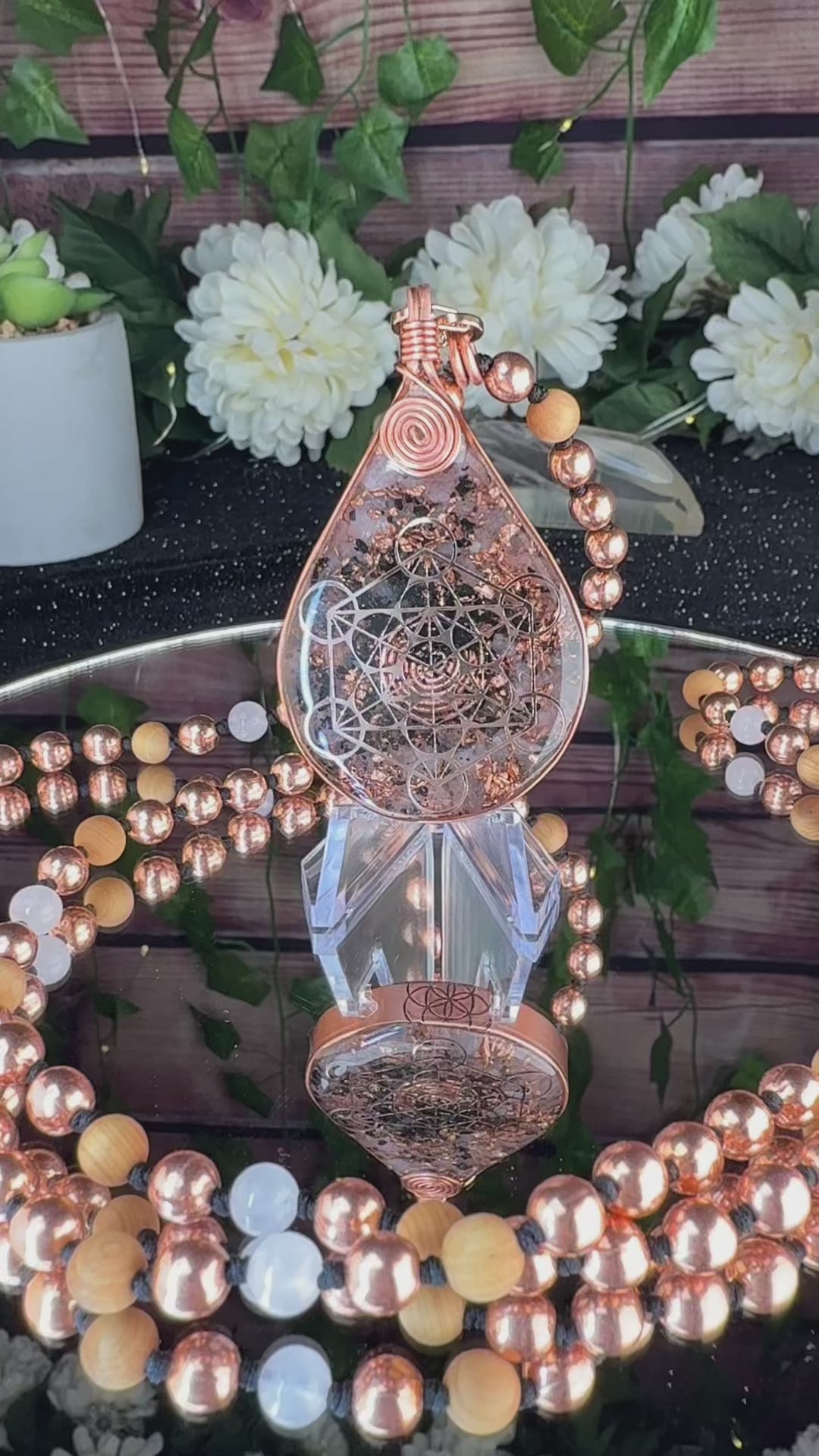 With Rose Quartz, Elite Shungite, Diamond Quartz, and Copper! On a 108 handknotted interchangeable Mala necklace with Copper, Cedar, and Rose Quartz beads 📿 Intentionally crafted and infused with Reiki. Included is info as well as a self guided workshop for setting intentions with the Seed of Life! More info in my bio 🌹